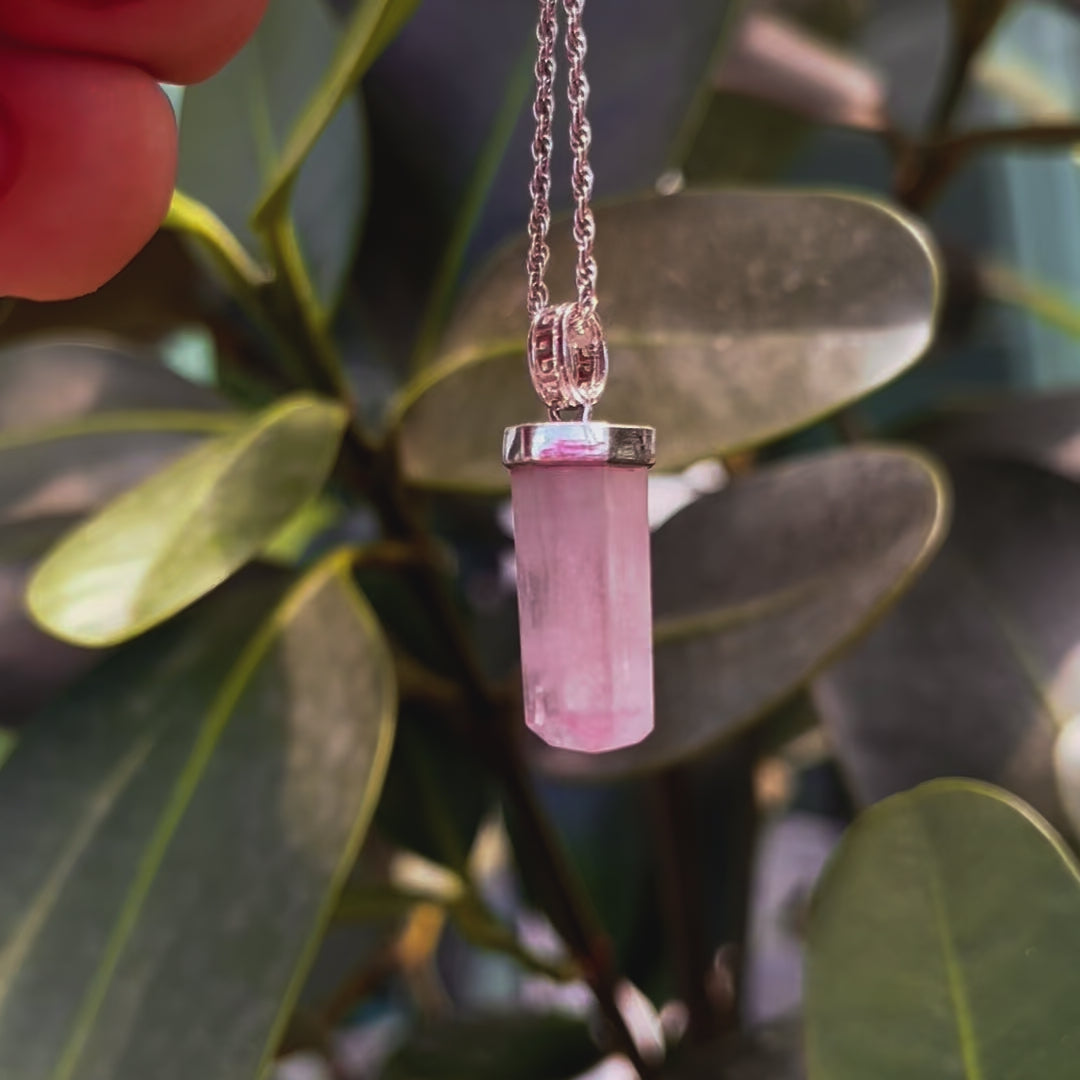 Raw uncut kunzite pendant in 925 Silver, rhodium plated.