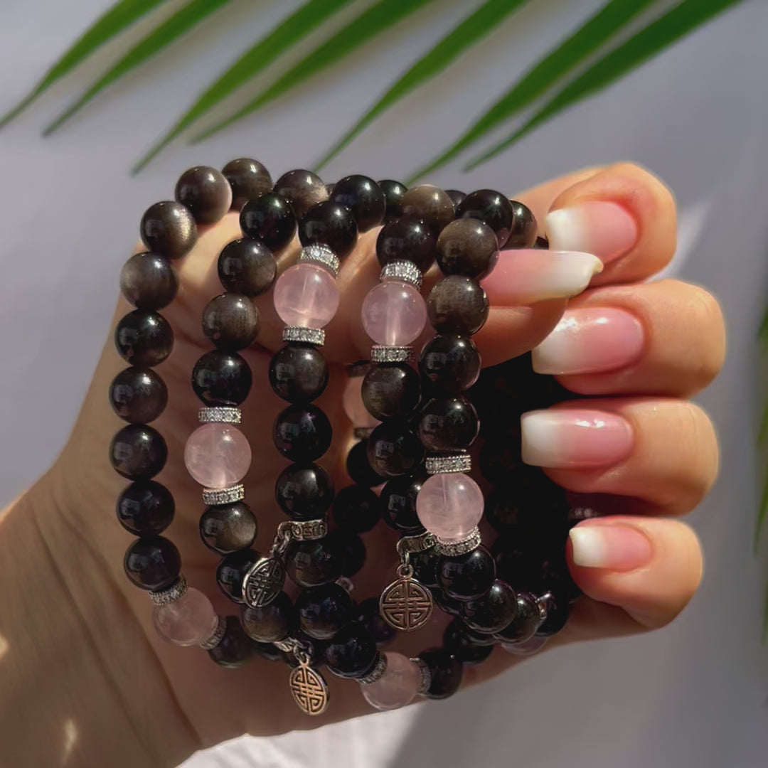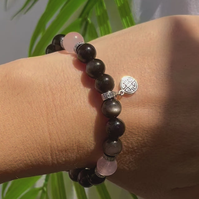 Silver Sheen Obsidian with transparent pink rose quartz from Brazil in 8mm bead and our signature fortune charm Lu.